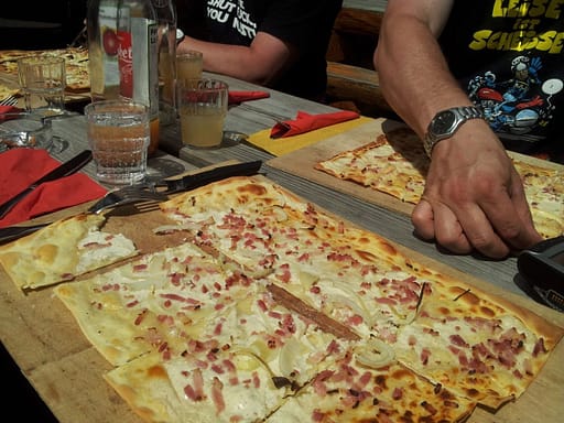 Gut eingerüttelt trafen wir um kurz nach zwei in Basses-Huttes ein und orderten die obligatorischen Flammkuchen. Massig Wasser und Apfelsaft dazu, strahlender Sonnenschein auf der Holzterrasse – Leben wie Gott in Frankreich reloaded.