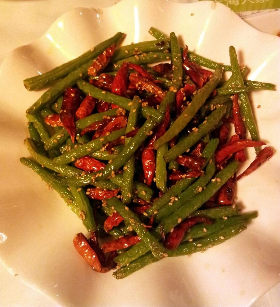 Ohne Pause landeten gebratene Bohnen mit ‚unterhaltsamer‘ roter Beilage auf dem Tisch, scharf und sehr aromatisch.