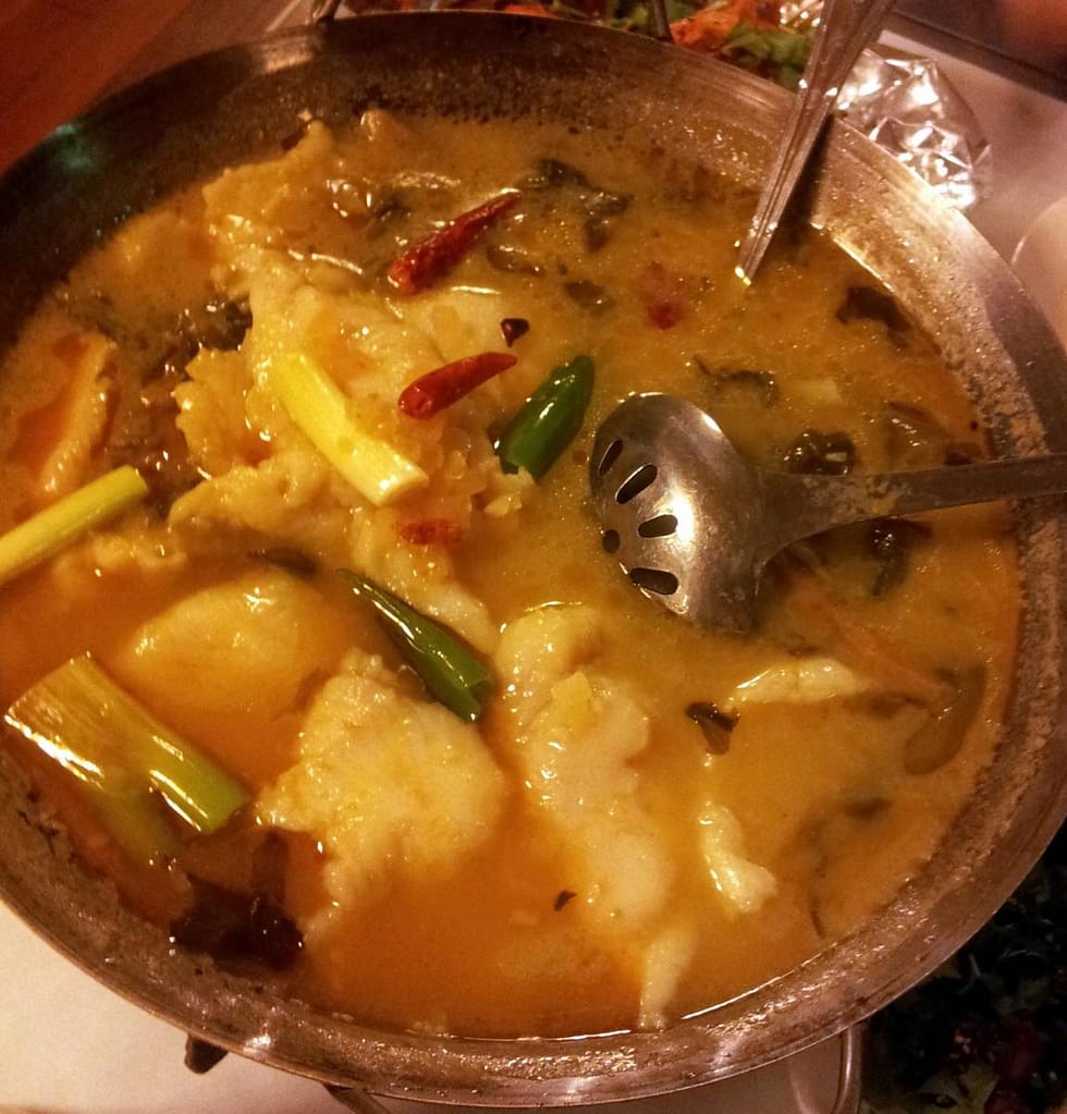 Nicht, dass wir davon nicht schon satt waren – das gebratene Lammfleisch auf Koriandergrün mit Sesam und der gekochte Fisch mit eingelegtem Gemüse musste auch noch in großen Mengen rein, weil einfach überragend.