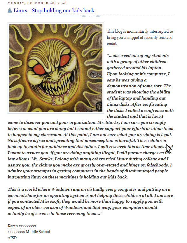 Ich nutze ja selbst seit mittlerweile 15 Monaten Linux auf allen meinen Rechnern, aber habe mich bisher noch gegen das Fanboy-Gehabe mancher in-der-Wolle-gefärbter Linuxer ein wenig gewehrt, obwohl die Argumente für open source software und freie Betriebssysteme wirklich sehr überzeugend sind.