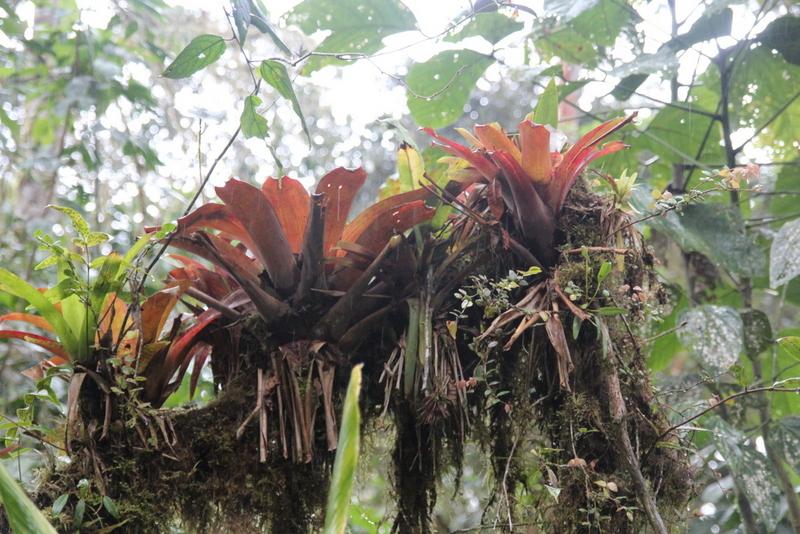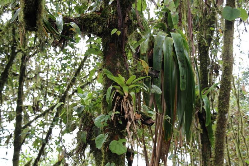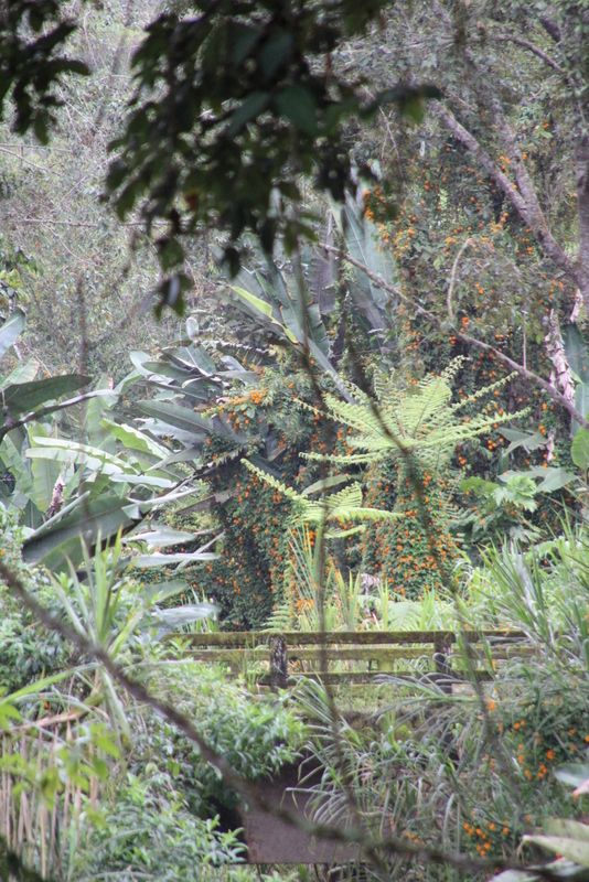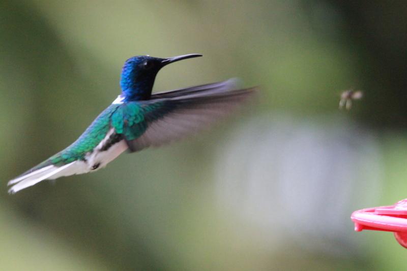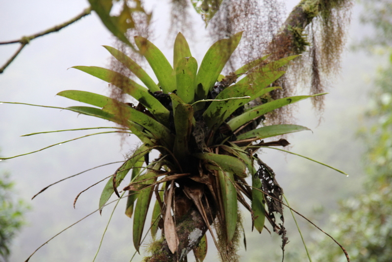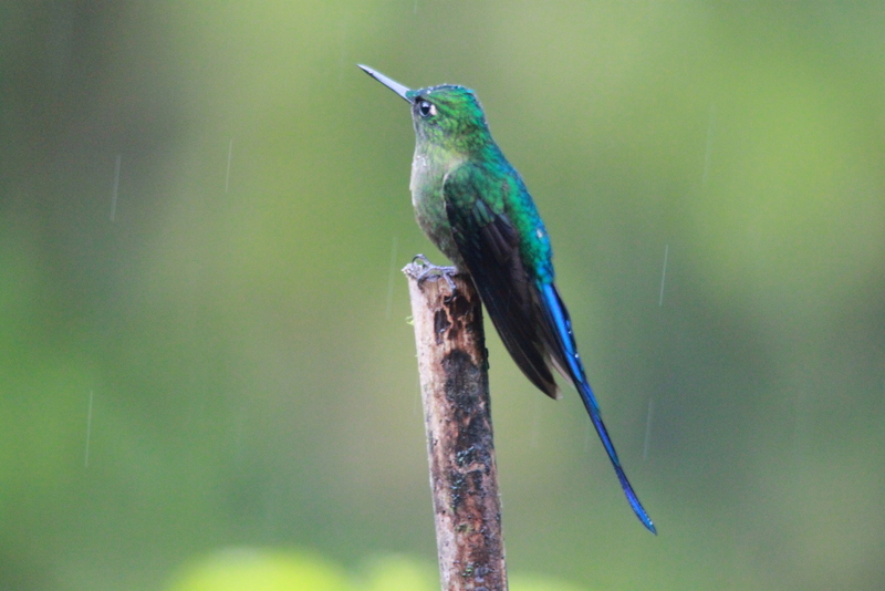 Die alte Straße zur Lodge ist unglaublich schlecht, aber dadurch haben wir perfekte Aussicht auf die tropische Nebelwald-Vegetation. Blattpflanzen in riesigen Dimensionen, Baumfarne von majestätischer Größe, Brugmansien in weiß und unzählige Bromelien auf den Bäumen Es geht wieder ordentlich rauf, nachdem wir vorher auf knapp 1.800m runter waren, geht es mindestens 400 m hoch und wir erreichen die Bellavista Lodge im strömenden Regen… An den Tränken gibt es Kolibris noch und nöcher, wir fotografieren fleißig, bevor es zum Mittagessen geht.
