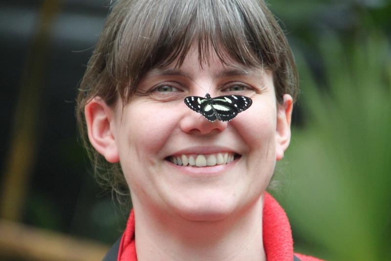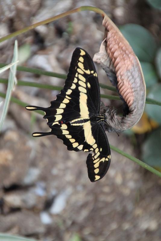 Die Ankunft unserer Gruppe verzögert sich beträchtlich, tatsächlich treffen sie erst um kurz vor zwölf ein, macht aber nichts, wir haben es gemütlich. Mit den anderen zusammen geht es dann zu einer Schmetterlingsfarm und obwohl das Wetter eher bescheiden ist, fliegen die ‚Mariposas‘ ordentlich und wir freuen uns an den nicht nur bunten, sondern zum Teil auch riesigen Insekten, die sehr zutraulich sind, Kathinka trägt einen längere Zeit als lebendigen Nasenschmuck ;-)