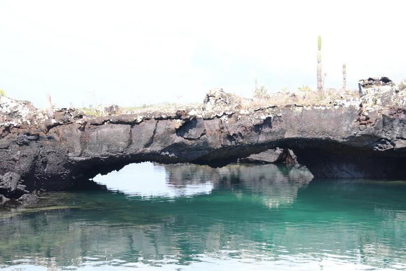 Wir umkreisen eine Felsinsel, auf der sich Tölpel und Seelöwen tummeln, dann geht es durch die Brandung (spannend!) in die Lava-Mangroven-Landschaft. Die Schönheit dieser Gegend macht sprachlos. Keine Welle, keine Bewegung und Bögen über Bögen von Lava, die aus eingebrochenen Tunneln entstanden und mit dem spärlichen Bewuchs der Region, Kakteen und niedrige Sträucher ein einmaliges Bild abgeben.