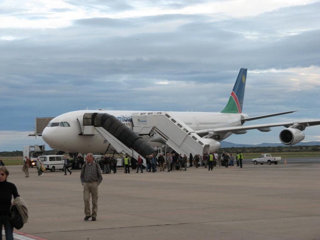 Um halb sechs abends laufen wir auf FFM Airport ein und kriegen unsere Plätze im leider vollständig ausgebuchten A300-340 der Air Namibia, und mit ein wenig Verspätung heben wir gegen halb zehn am Abend nach einem Dinner im Moschmosch am Gate und einem schönen Weißbier ab.