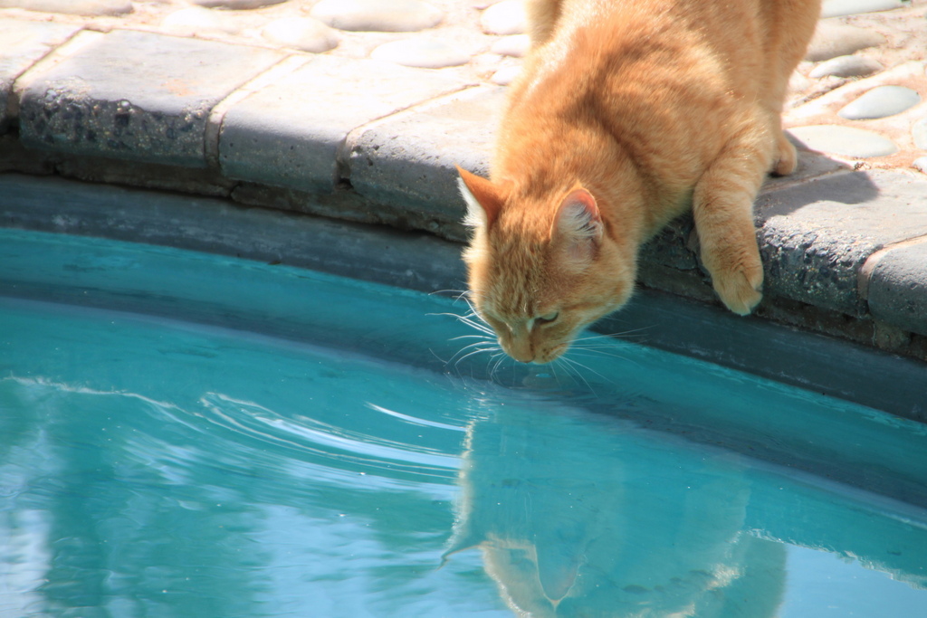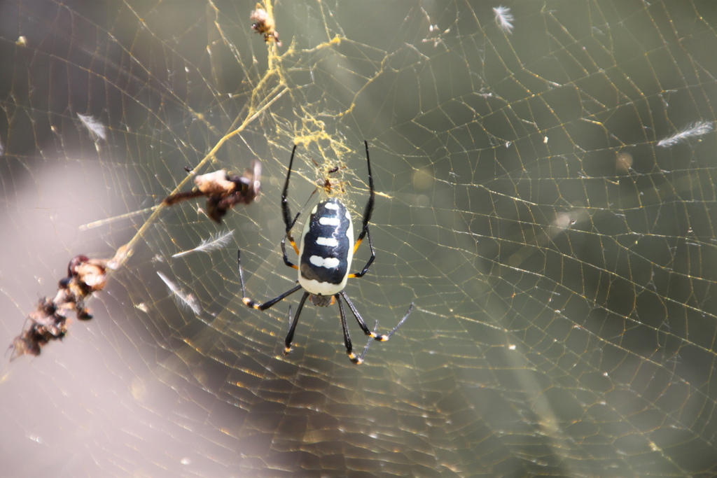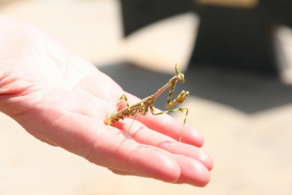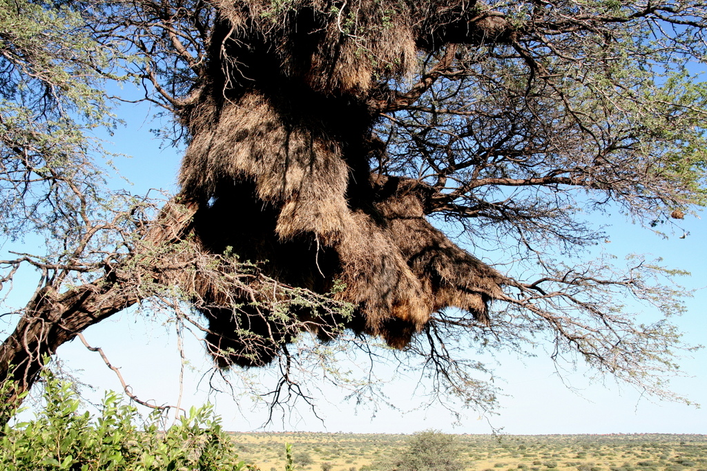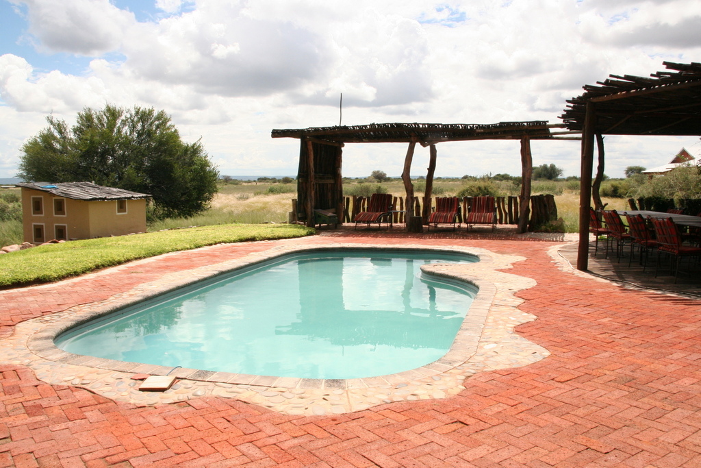 Nach einem sehr interessanten Lunch mit Kalahari-Trüffel-Lasagne (und einem ausgezeichneten, vor allem ausgezeichnet kalten Bier für yours truly) schmeißen wir uns an und in den Pool. Die Tierwelt wird eindrucksvoll vertreten von einer Netzspinne, die ihr Netz zwischen einen Busch und die Poolbar gespannt hat, mit teilweise über 3m langen Haltefäden. Eine Stabheuschrecke läuft Gefahr, flachgetrampelt zu werden, aber ich hab sie noch rechtzeitig gesehen.