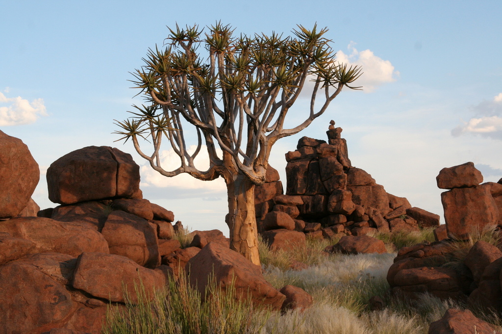 Zum Sonnenuntergang, der aufgrund einer dichten Wolkendecke leider ausbleibt, fahren wir in den Köcherbaumwald. Köcherbäume wurden von den Buschmännern zu ebendiesem Zweck gebraucht, die ausgehöhlten Äste geben sehr gute Köcher für die Pfeile ab, da der Köcherbaum sein weiches, wasserspeicherndes Inneres mit einer ledrigen Außenrinde schützt.