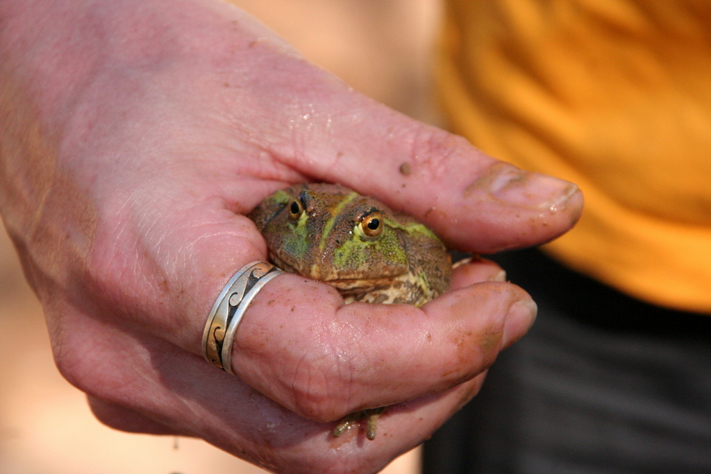 Amphibisches Leben in Namibia zu erleben hätte ich mir nun wirklich nicht erträumt und die Frösche sind darüber hinaus auch sehr lustig, weil klein und aufgeplustert, von der Zeichnung wie europäische Wasserfrösche, aber nur zu sehr kurzen Sprüngen in der Lage und von daher einfach zu fangen.