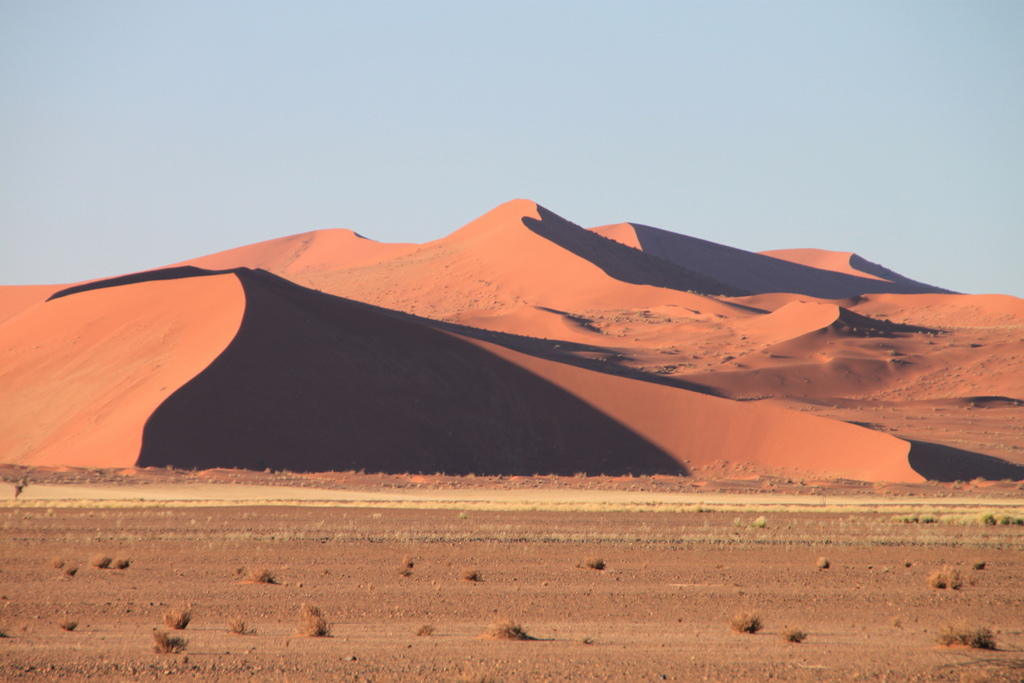 Auf geht es zum Sossusvlei, dessen Tore im Sonnenaufgang geöffnet werden, heute sogar eine Viertelstunde früher. Da die Straße geteert und die Geschwindigkeit auf 60 km/h gedrosselt ist, können wir uns in Ruhe und ausgiebig der reichhaltigen Tierwelt mit vielen Springböcken und Oryx-Antilopen, wieder mal einem Schakal und zwei Sekretären widmen.