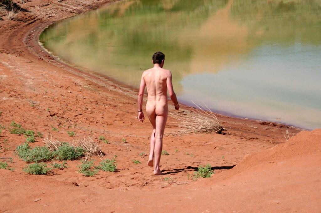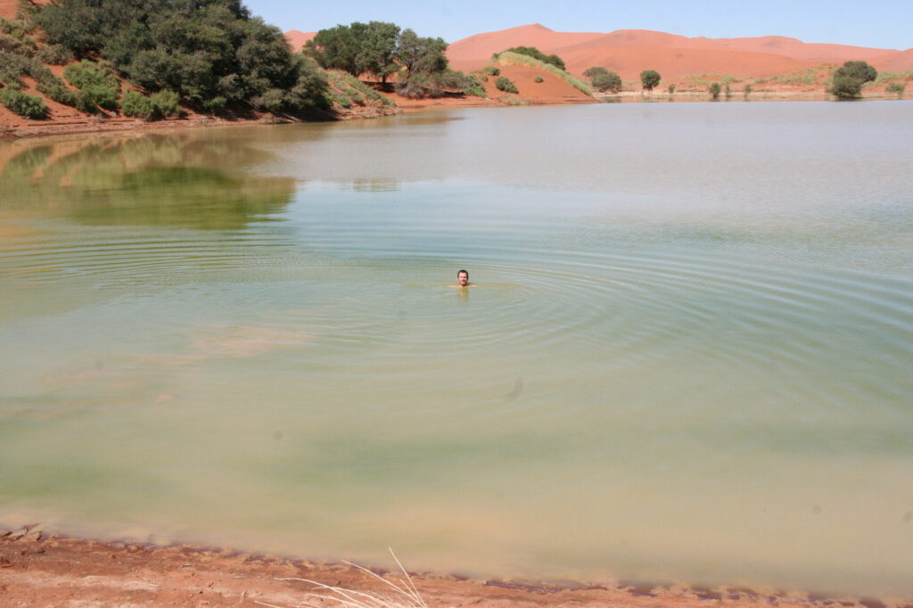 Dort pfeife ich auf wohl auch nicht gegebene Konventionen und gehe mangels Badehose nackt ins Wasser des Vlei. Im algendurchzogenen grünen Wasser schwimmen und dabei das rot-blaue Panorama genießen, ist ein unvorstellbares Erlebnis…