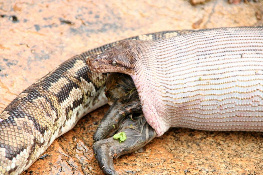 Gustav schiebt den Schwanz beiseite und es gelingen ein paar eindrucksvolle Aufnahmen vom Reptil und seiner Mahlzeit, dann aber zeigt sich der Python massiv gestört durch unsere Anwesenheit, er würgt den Klippschliefer wieder aus und macht sich aus dem Staub, was wir beides sehr bedauern, denn wir wollten ihn nicht um seine Beute bringen.