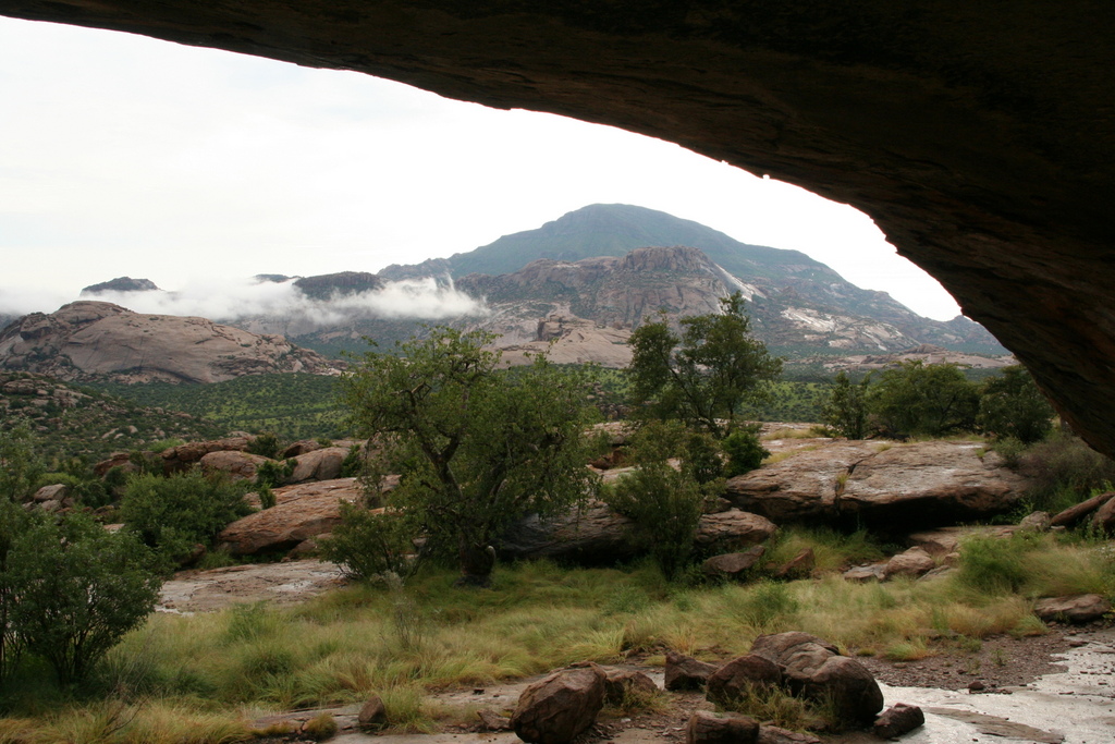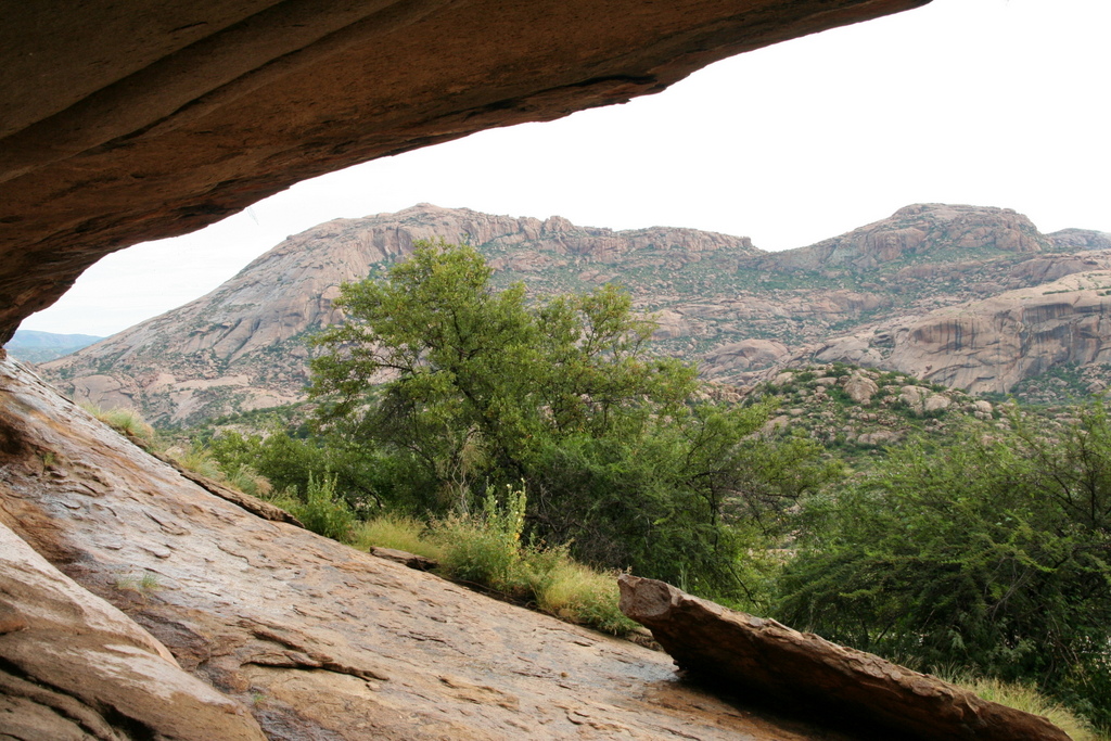 In der Grotte sind uralte Felszeichnungen (der weiße Elephant), Jagdszenen mit vielen Menschen und eine langgestreckte Giraffe, die man auf dem Rücken liegend am besten sehen kann. Das Panorama ist erschlagend, wir haben einen schönen Blick auf Bull’s Party, wo wir gestern abend unseren Sundowner zelebrierten.