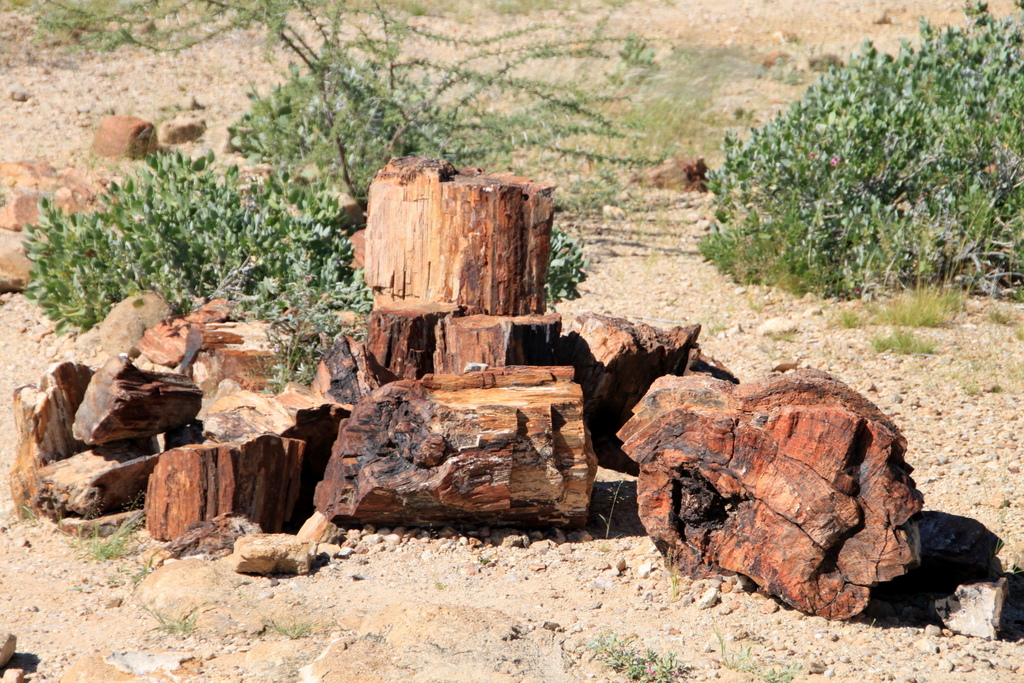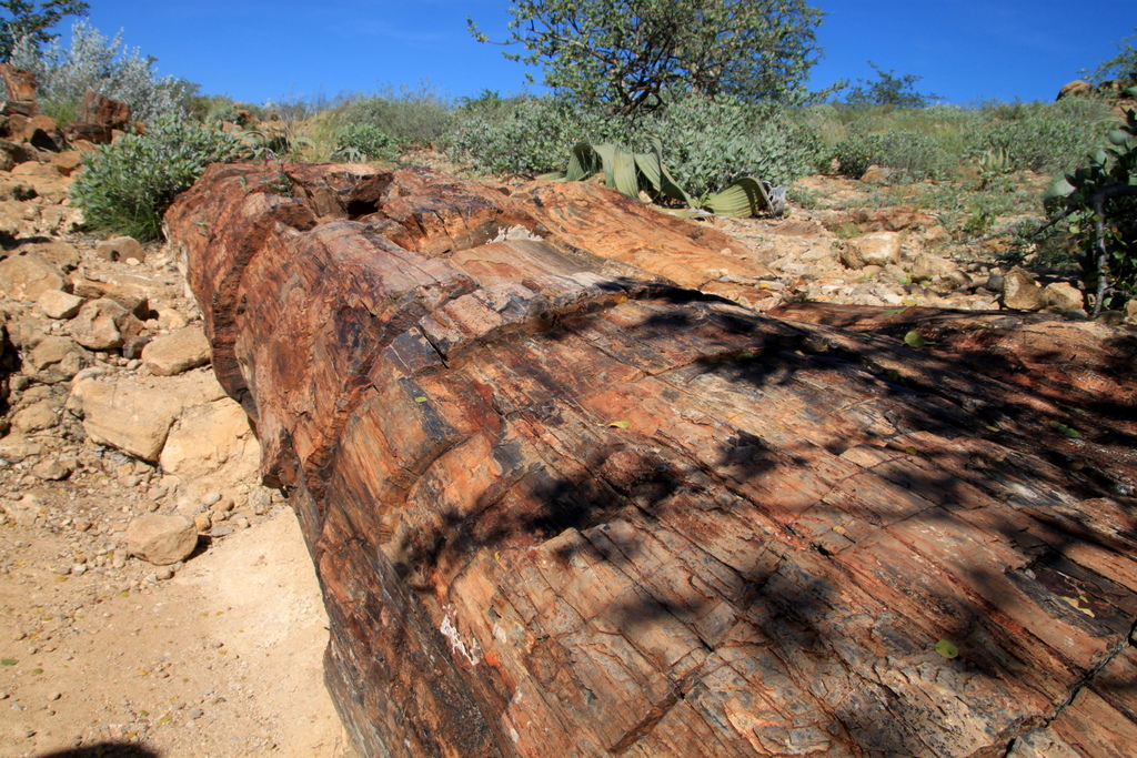 Ganze Baumstämme hat es da und wir fragen uns im Scherz, wie wohl eine Tischplatte daraus, gesägt und poliert, aussehen würde – an der Stelle versteht aber auch unser Reiseleiter keinen Spaß, der von der namibischen Art, mit Kulturgütern umzugehen, hunderprozentig überzeugt ist. Die ist ja auch bei solchen Sachen wirklich recht rigoros.