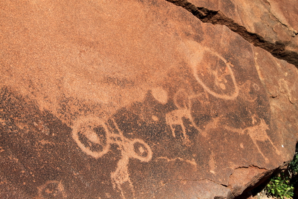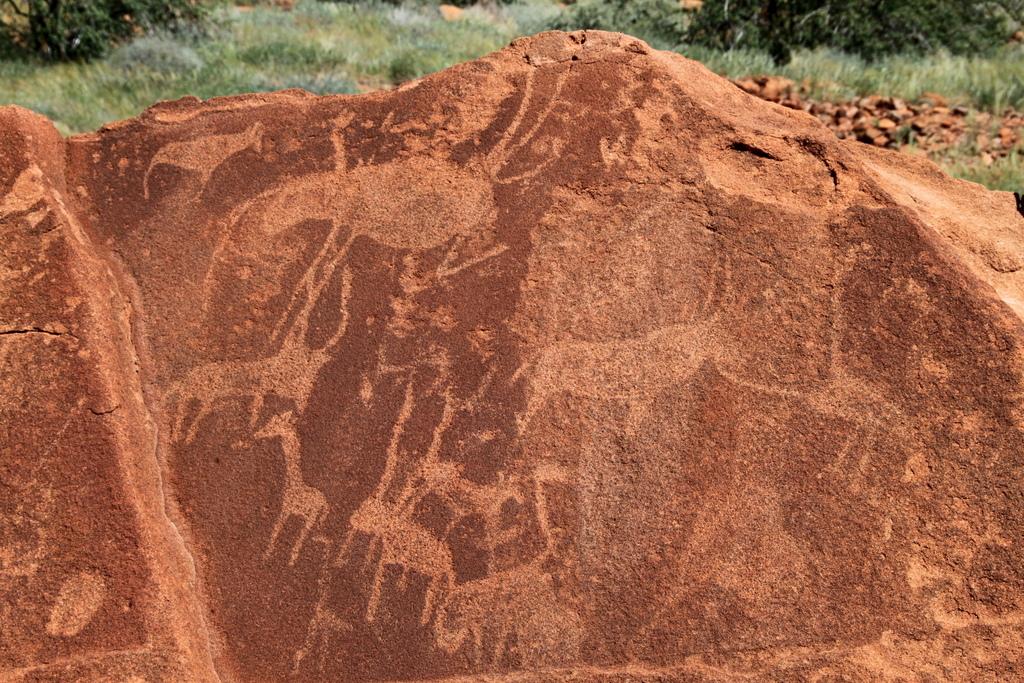 T.S. Eliot muss unseren nächsten Stopp Twyfelfontein (zweifelhafte Quelle) vor Augen gehabt haben, als er die berühmten Zeilen für sein ebenso berühmtes Gedicht ‚The waste lands‘ verfasste. Wenig Schatten, aber viele ‚rostige‘ Steine gigantischer Ausmaße liegen rum und auf einigen haben die Buschleute Zeichnungen eingraviert – auf zweitausend Jahre datieren die ältesten. Teilweise wurden die Zeichnungen als Beschreibungen, manche als Karten verwendet, aber es finden sich auch Reiseberichte – in diesem Teil vom Süden, wie die Zeichnung eines Pinguins verrät.