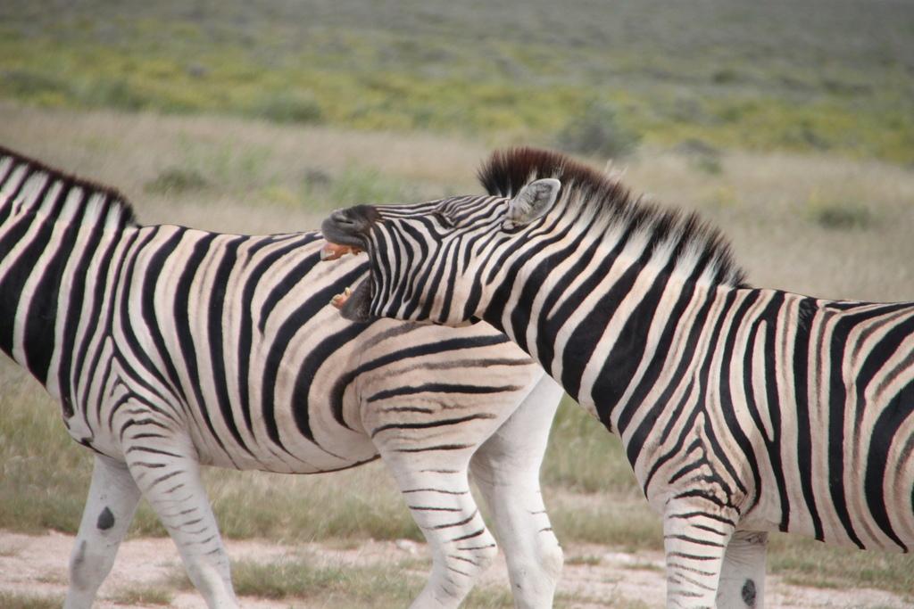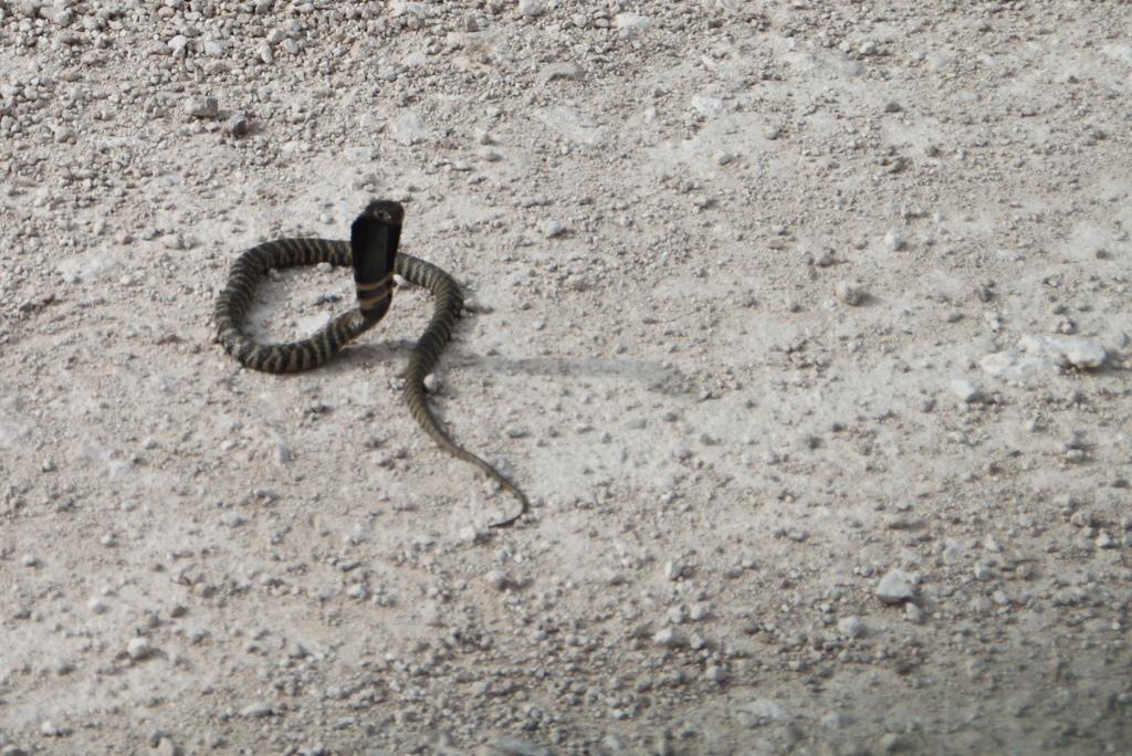 Steppenzebras haben im Gegensatz zu Bergzebras keine Streifen bis an die Hufe, außerdem haben letztere einen weißen Bauch. Wir schauen Erdhörnchen zu, die mit einer Agame spielen (später auch in der gefährlichen Konfrontation mit einer wenigstens zwei Meter langen Kobra), sehen Riesentrappen und Gnus, Oryx-Antilopen und Springböcke sind sowie immer präsent.