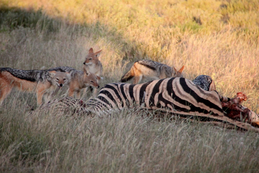 Dann erreichen wir langsam die Lodge, aber davor kommt noch ein absoluter Höhepunkt – dort, wo sich die Autos ballen, liegt ein gerissenes Zebra, an dem sich ein Haufen Schabrackenschakale gütlich tun – bis zum grandiosen Auftritt einer Löwin, die den Riss für sich beansprucht und die Schakale durch die Gegend scheucht. Im Licht der untergehenen Sonne leuchten die bernsteinfarbenen Augen der großen Raubkatze – ein fantastisches Erlebnis…
