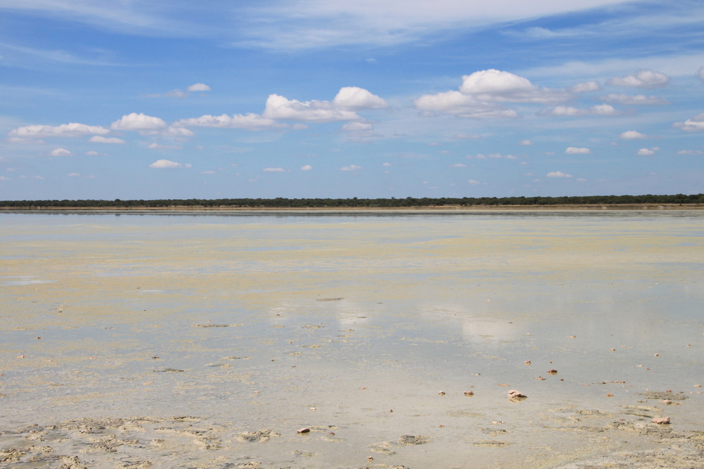 Ein Abstecher in die Etosha-Pfanne. Normalerweise eine öde Salz-Wüste, potteben, glänzt sie nun mit Wasser bis zum Rand.