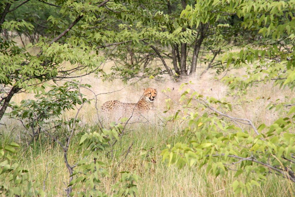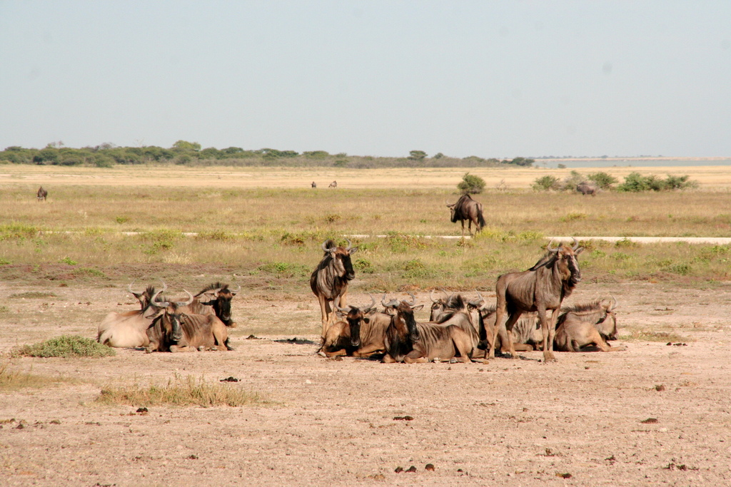 Am Nachmittag sehen wir ein paar große Kudus, Giraffen, Zebras und Gnus bis zum Abwinken und zwei wunderschöne Geparden stehen auf der Straße rum, verziehen sich aber bei Annäherung ins nahe Gebüsch.