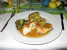Des weiteren erfahren wir, wieviele Erdbeersorten es auf der Nordhalbkugel (12) und auf der Südhalbkugel (über 1000) gibt, dass ein Matjes kein Hering nach Matjesart ist und noch vieles weiteres an Kulinarischem und Kuriosem. Unaufhaltsam weiter schreiten wir zum Hauptgang, die Maispoularde mit Paella und Zucchinistreifen ist ein Gedicht, auch wenn Matthias die Tiere mit den vielen Beinen oder völlig ohne Beine, dafür mit Schalen, mit gelindem Argwohn verzehrt ;-)