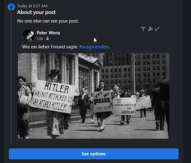 What crime did I commit? I posted a picture of a ‚peace-demonstration‘ in the US back in the days of the second world war. Of course aimed at the bunch of weird people demonstrating for ‚peace‘ in Ukraine and wanting to stop weapons deliveries, i.e. have Ukraine occupied…