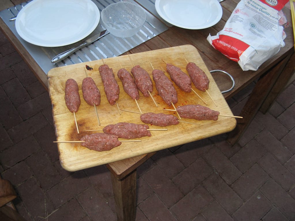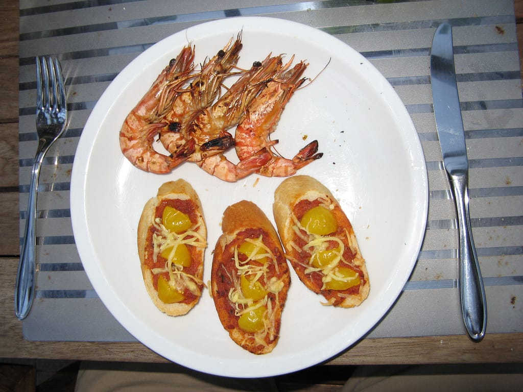 So wurde aus einer Unterhaltung mit Chili (das ist der Mann mit den kurzen Hosen) im ICQ heute morgen binnen weniger Stunden ein pomfortionöses Essen mit Gambas und Bruschetta als hors d’ouevre, handgerollten Cevapcici, grünem Salat und Fladenbrot zum Hauptgang sowie einem Dessert aus Bananenbrot mit süßem Belag nach Wahl (Nutella *g*) und Grappa für Pappa.