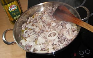 Die Meeresfrüchte in kochendem Wasser blanchieren, danach mit dem geschabten oder gepressten Knoblauch in heißem Olivenöl schwenken, mit Weißwein und Tomatensauce abgießen.