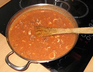 Tomatenmark dazugeben und ca. 45 min. köcheln lassen. Mit Salz und Pfeffer abschmecken.